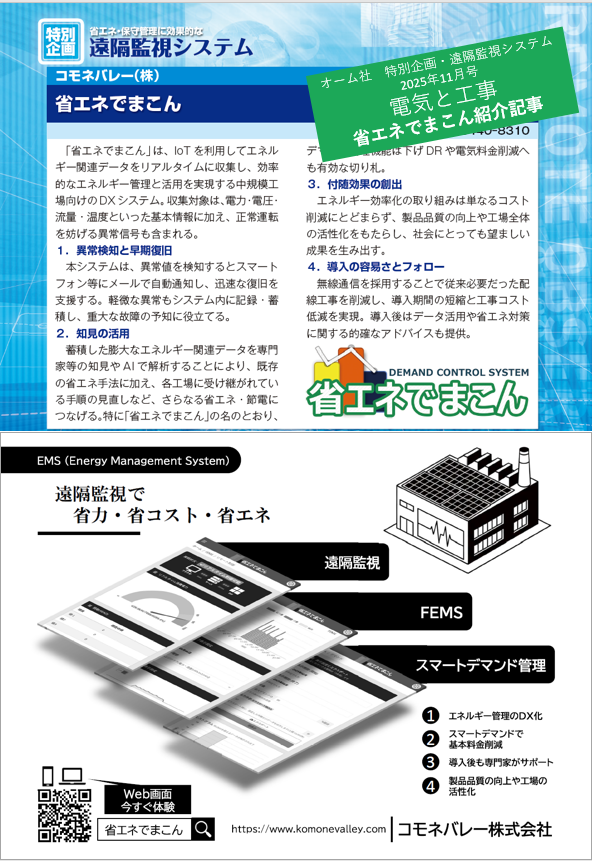 オーム社の電気技術雑誌『電気と工事』(2025年11月号)「遠隔監視システム」特集に、当社のエネルギー管理システム「省エネでまこん」が紹介(右画像)されました。