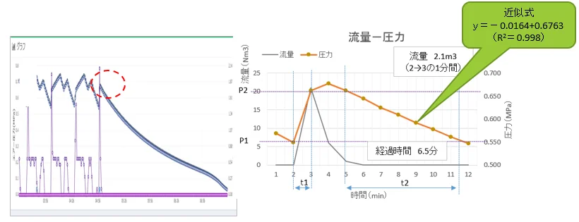 - 図より、漏れ量は0.3[m3/min](2.1[m3]/6.5[min] 漏れ率=t1÷(t1+t2)=13%)。漏れコストを計算すると、約1[円/min]の漏れであり、8時間(※)では480円の損失。本例は小規模工場の例(空気消費量が2[m3/min])であり、大規模工場ではさらに損失は大。
