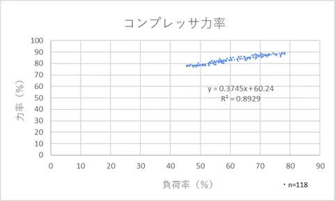 なお、本例では強い相関がみられましたが、同一メーカでも機種・型式により負荷率と力率の関係は微妙に異なるものと思われます。また、計測点はコンプレッサの電源ライン(圧縮機、ドライヤ、ファンなど含む)です。